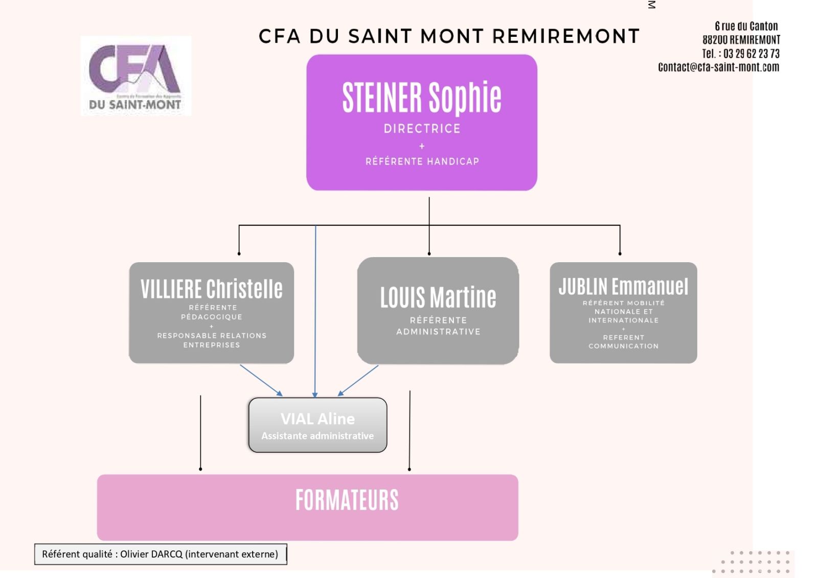 L'organigramme du CFA du Saint-Mont illustre une organisation simple et efficace, centrée sur l'accompagnement des apprentis et le lien avec les entreprises.