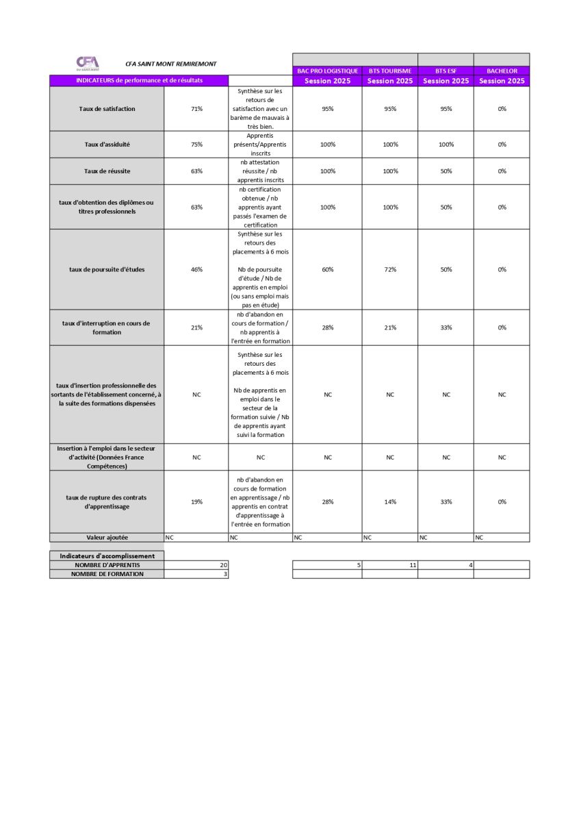 Les indicateurs de performance du CFA Saint Mont Remiremont pour la session 2025 mettent en évidence de très bons résultats.
